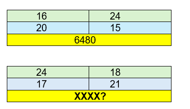 The official answer is: to get to 6,480 you multiply right hand column figures 24 by 15 (=360) and add left hand column figures 16 and 20. Then you multiply the two resulting totals (360 x 36) and divide the answer (12,960) by 2. Applying the same set of processes to the lower table gives you 7749.