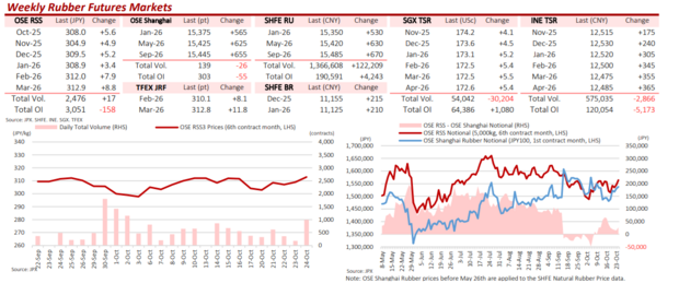 In Shanghai, China, the benchmark January 2026 SHFE RU contract gained 3.8%, while the Shanghai INE TSR January delivery rose 1.4% compared to the week before.
