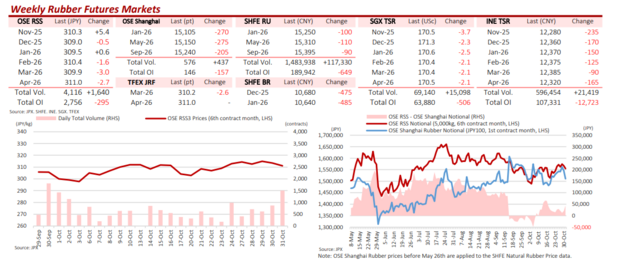 Tokyo – Natural rubber (NR) futures softened in the final trading week of October as China’s manufacturing activity came in below expectations, adding pressure to market sentiment.