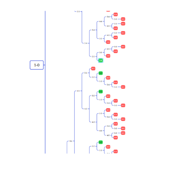 Result was 18 6-2 and 296 others, so 6-2 would happen at a probability of 0.0573 per match. But for 8 matches it is 0.0573 to the power of 8, a minuscule probability of 1.16612E-10. If someone had a bet on that, they’d be very rich now!
