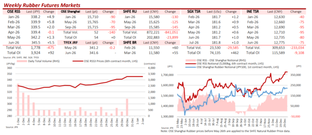 In Japan, on the Osaka Exchange (OSE), May delivery rubber contract closed 0.8% higher week-on-week, while contracts on the Shanghai Futures Exchange (SHFE) and INE declined by 0.8% and 0.7%, respectively.