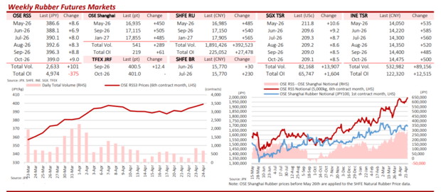 In Japan, OSE rubber’s September 2026 contract settled 2.6% higher week-on-week in light trading, while SHFE and INE rubber contracts closed up 3.3% and 4.3%, respectively.