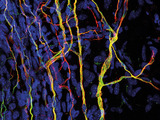 An image of nerve endings in the cornea, modified by Atat1 (yellow), a molecule which affects the f…